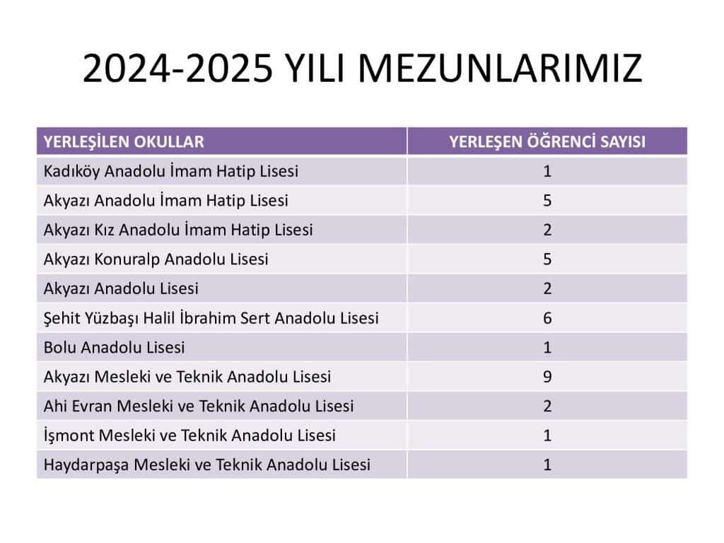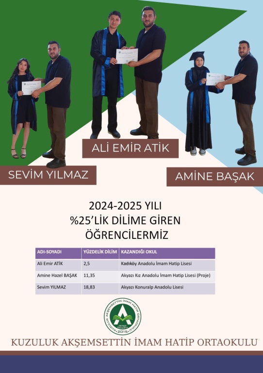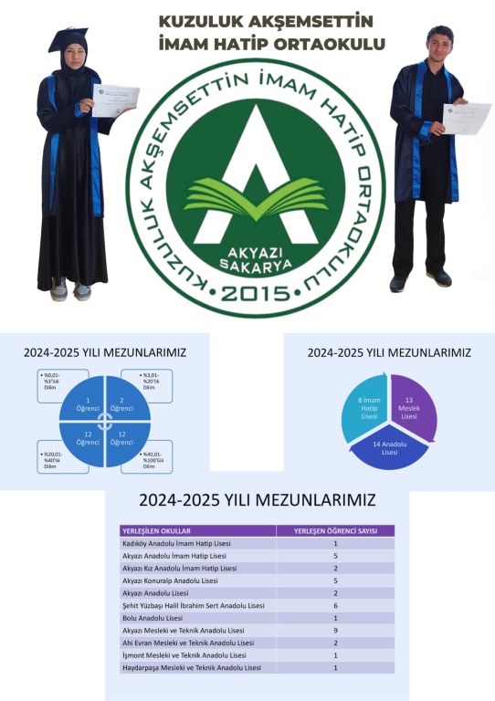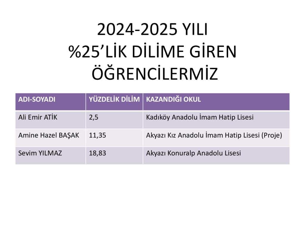 2025 Yılı Liselere Giriş Sınavına okulumuzdan 26 öğrenci başvuru yapmıştır. 3 öğrencimiz %20'lik dilime girmiştir. Yapılan yerleştirmelerde okulumuzdan mezun olan 35 öğrencimizin yerleştirme sonuçlarını gösterir tablolar sunulmuştur. Öğrencilerimize bundan sonraki eğitim öğretim hayatlarında başarlıar dileriz.